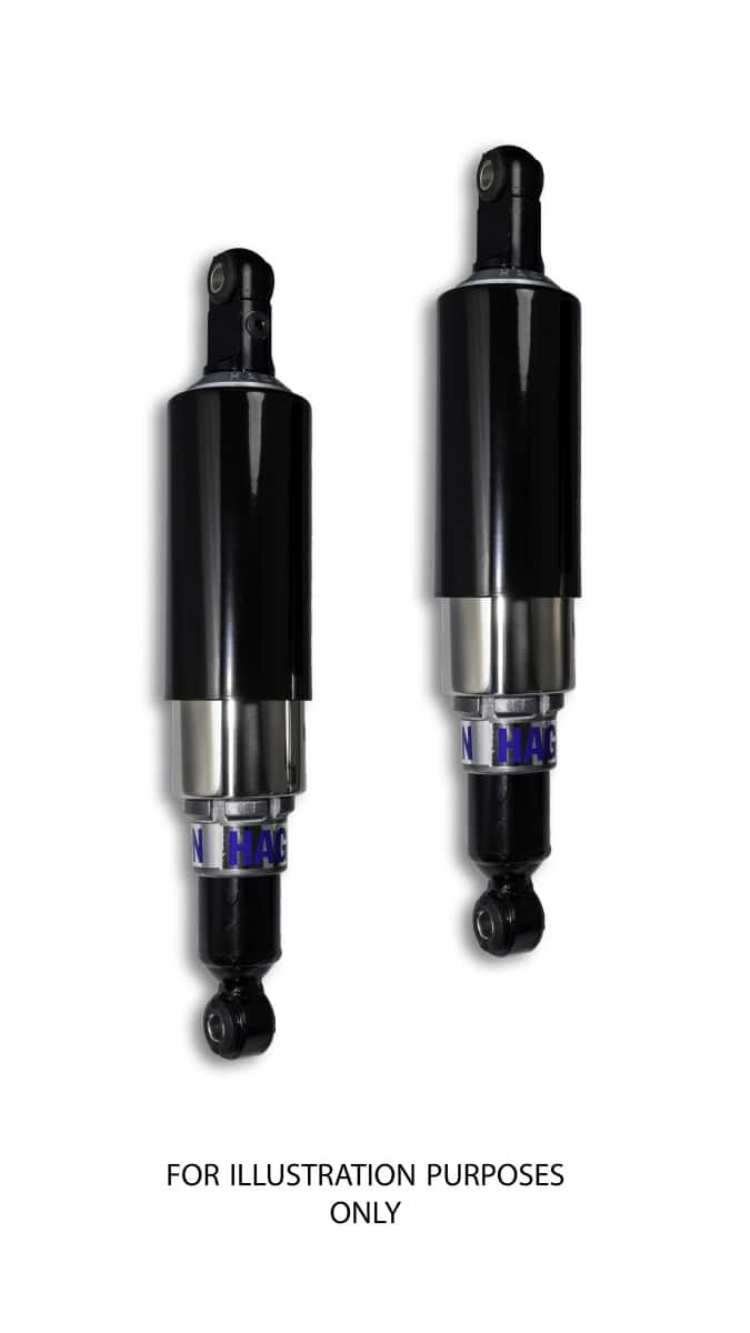 Type 2820 Adjustable Shock – Classic III Full Black and Polished Covers, Black painted 28mm sealed damper unit fully shrouded with gloss black powder coated stainless steel top cover and polished stainless steel lower cover, Wide ranging single circuit progressive damping adjustment with automatic compression / rebound balance, 3 position spring pre-load adjustment by enclosed cam. Supplied as complete pair with mounting bushes, tools and instructions for spring and damping adjustments. These units are designed to be fitted with the damping adjuster at the bottom. 2 year guarantee.