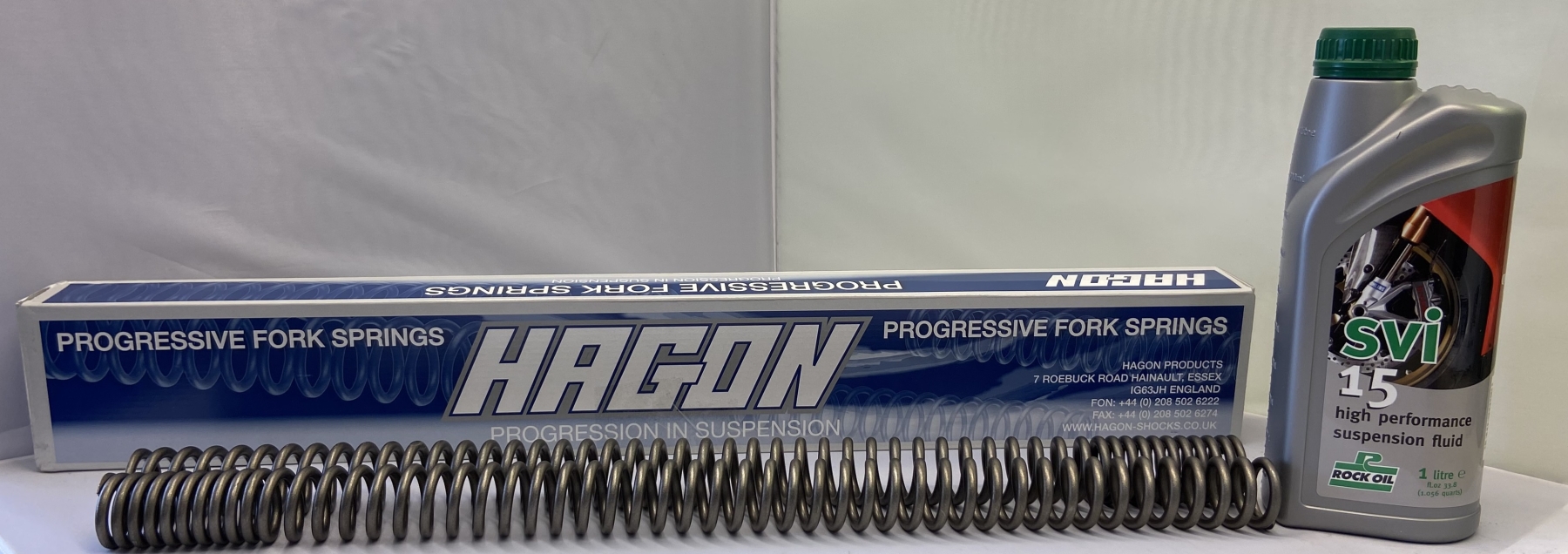 Hagon Progressive Fork Springs are designed for improved handling and rideability. The progressive winding means that as the suspension becomes compressed the springs become stronger. These forksprings come complete with oil, fitting instructions and spacers if required