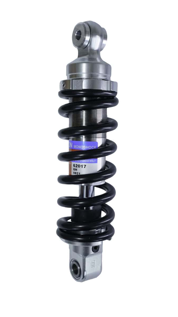 Hagon Mono Shock built to your rider weight and riding style, 38mm Stainless steel damper unit fully re-buildable, 18mm piston rod, wide ranging single circuit progressive damping adjustment with automatic compression / rebound balance. Black powder coated spring, fully progressive spring pre-load adjustment. Supplied complete with end mounting bushes / bearings, tools and instructions for spring and damping adjustments. 2-year guarantee.